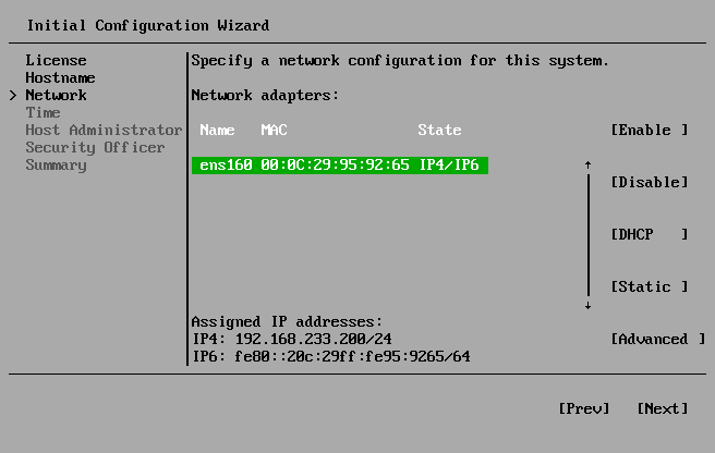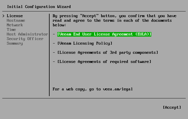 But now let’s take a look into the tui-based installation configuration wizard. I had to setup only the basics like hostname, IP address and passwords. So worries about that! Right to the start I have to accept the legal things.