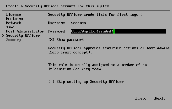 If you choose to enable the Security Officer account, every destructive action in the host management console—such as enabling SSH, modifying configuration files, or starting the backup service—will require approval from the Security Officer. This additional layer of security enhances control and oversight over critical operations. Security officer does not have access to Veeam Backup & Replication.